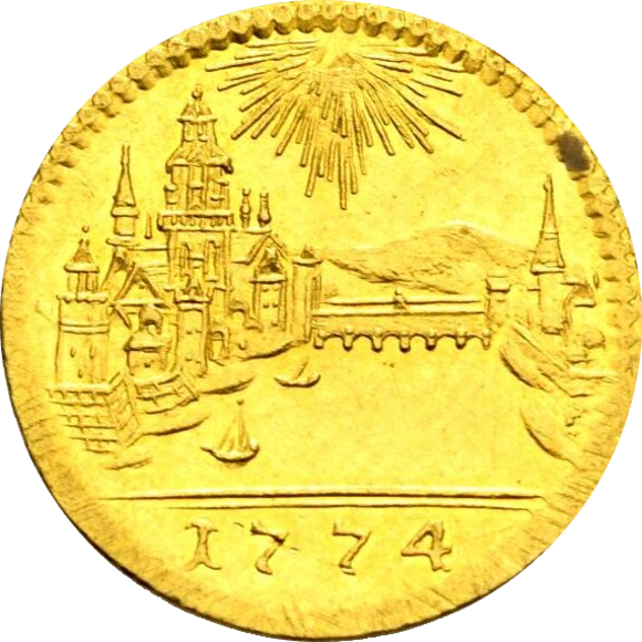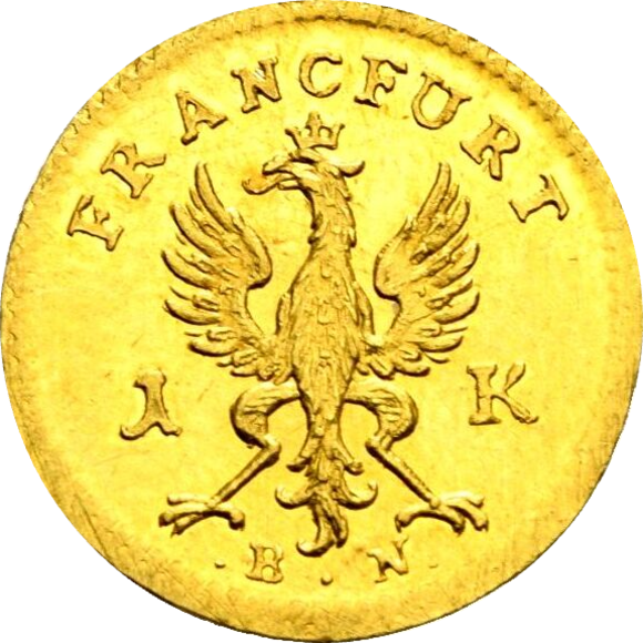 当金貨の裏面にはフランクフルトの都市景観が描かれ、表面にフランクフルトの市章、