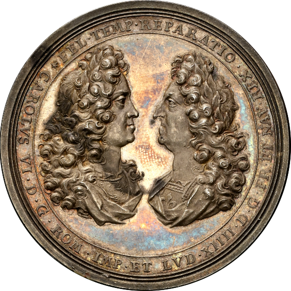 表面は、向かって左がカール6世の右向き肖像、向かって右がルイ14世の左向き肖像、